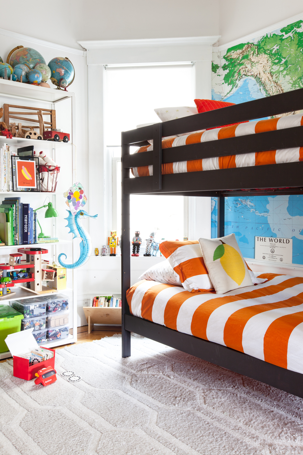 A Jordan Ferney tem um blog muito inspirado sobre festas o Oh happy day e uma casa com cara de casa, muito linda! Amei tanta coisa: o sofá verde, a geladeira vermelha (como aqui em casa) e principalmente a parede com o mapa no quarto dos meninos. Muito me debrucei em mapas na minha infância, comecei a viajar muito antes do primeiro vôo.